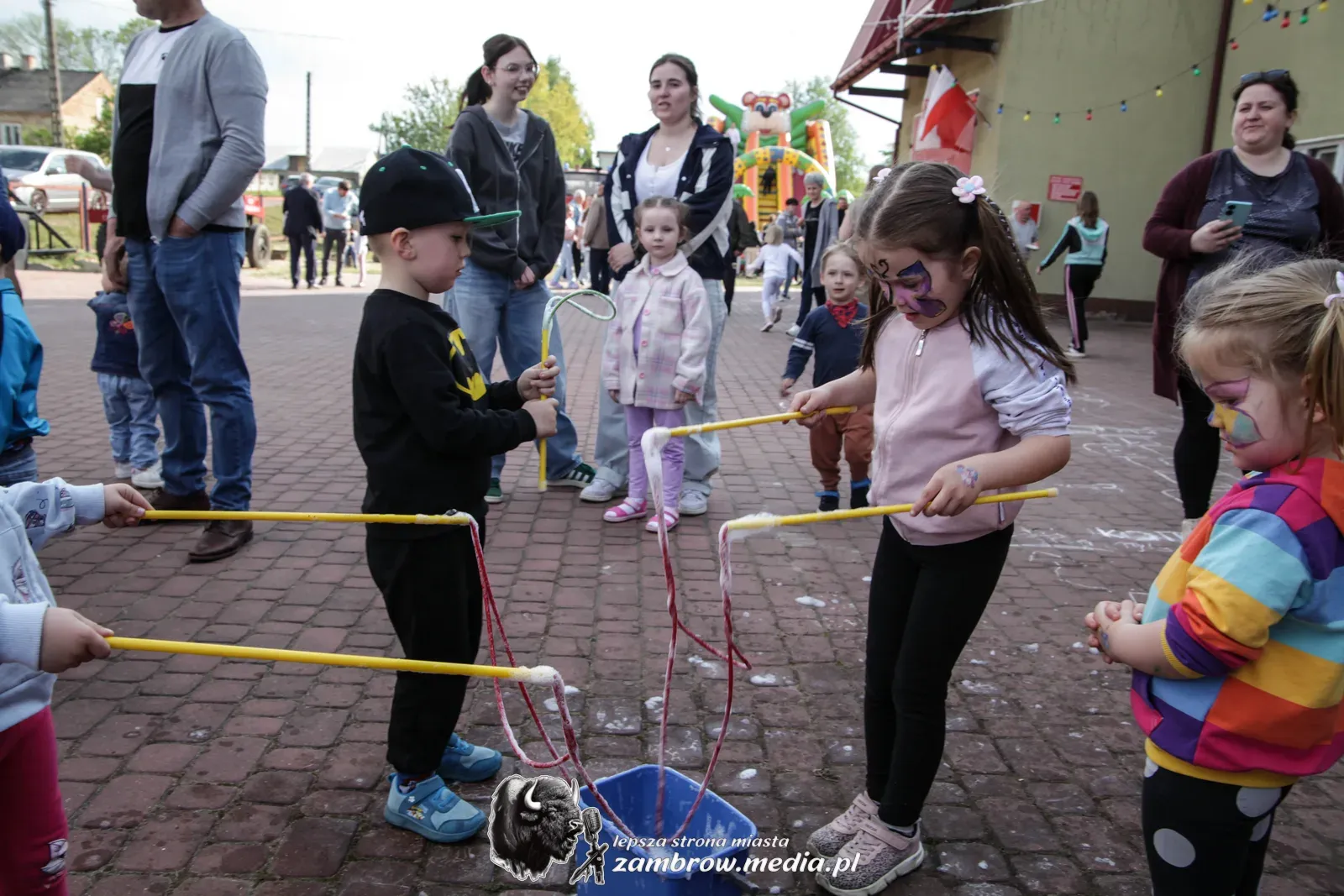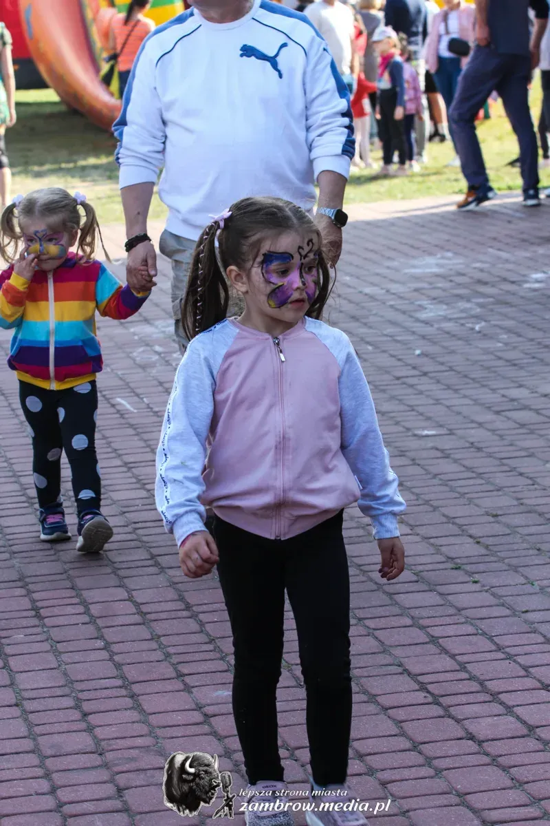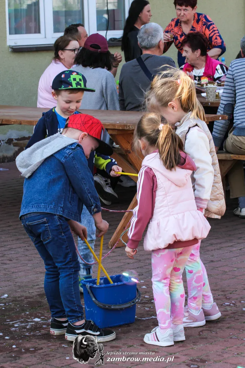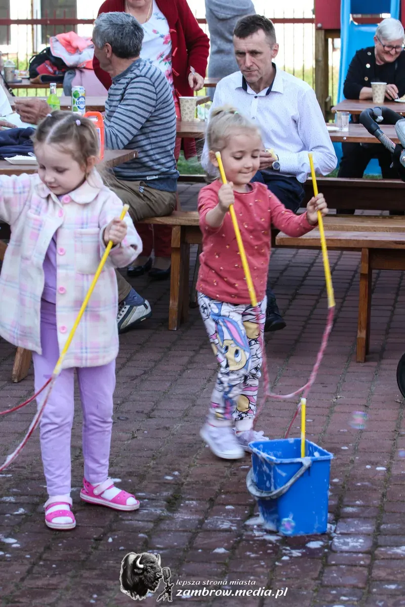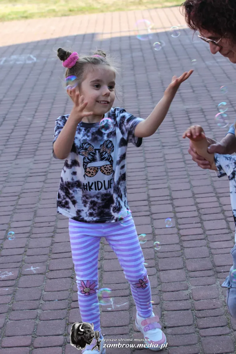 Mali uczestnicy mogli spróbować swoich sił w puszczaniu baniek mydlanych, malowaniu kredą na asfalcie oraz budowaniu konstrukcji z klocków na czas.