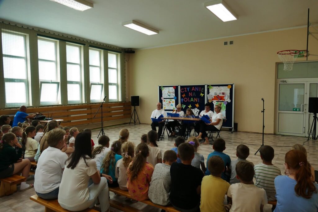 18 czerwca w Szkole Podstawowej w Wiśniewie po raz drugi odbyła się ogólnopolska akcja pod hasłem „Czytanie na Polanie” [edycja 2025] realizowana w ramach kampanii CAŁA POLSKA CZYTA DZIECIOM. W tygodniu poprzedzającym wydarzenie uczniowie pod kierunkiem nauczycieli tworzyli plakaty ukazujące zalety czytania. Każdy plakat promował hasło zachęcające do sięgania po książki. Plakaty zostały wyeksponowane w formie galerii prac, która towarzyszyła uczestnikom podczas oficjalnej części akcji – specjalnego spotkania czytelniczego z udziałem aktorów Teatru Form Różnych działającego przy MOK w Zambrowie. Wydarzenie otworzyła dyrektor szkoły i przedstawiła zaproszonych gości, a także krótko zaprezentowała działalność TFR. Następnie aktorzy wcielili się w bohaterów opowiadania „FLORKA I BUZIAKI-CZYTAKI” autorstwa Roksany Jędrzejewskiej-Wróbel. Dzięki aktorskiemu odczytaniu tego humorystycznego opowiadania uczniowie mogli poczuć magię kryjącą się w książkach oraz poznać zalety wspólnej lektury w rodzinnym gronie. Po występie cała społeczność szkolna wraz z zaproszonymi gośćmi zrobiła pamiątkowe zdjęcia promujące ideę akcji „Czytanie na Polanie”.