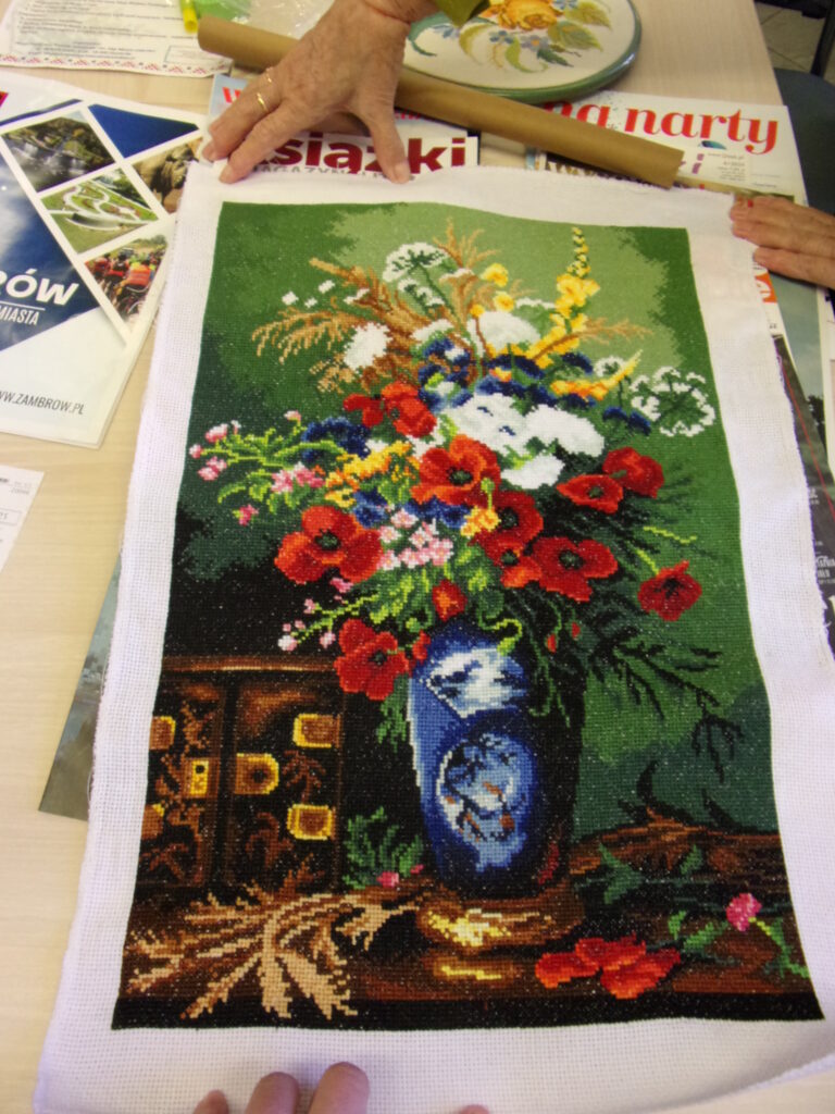 A na zdjęciach prezentujemy prace czynnych członków pracowni haftu Igiełka..