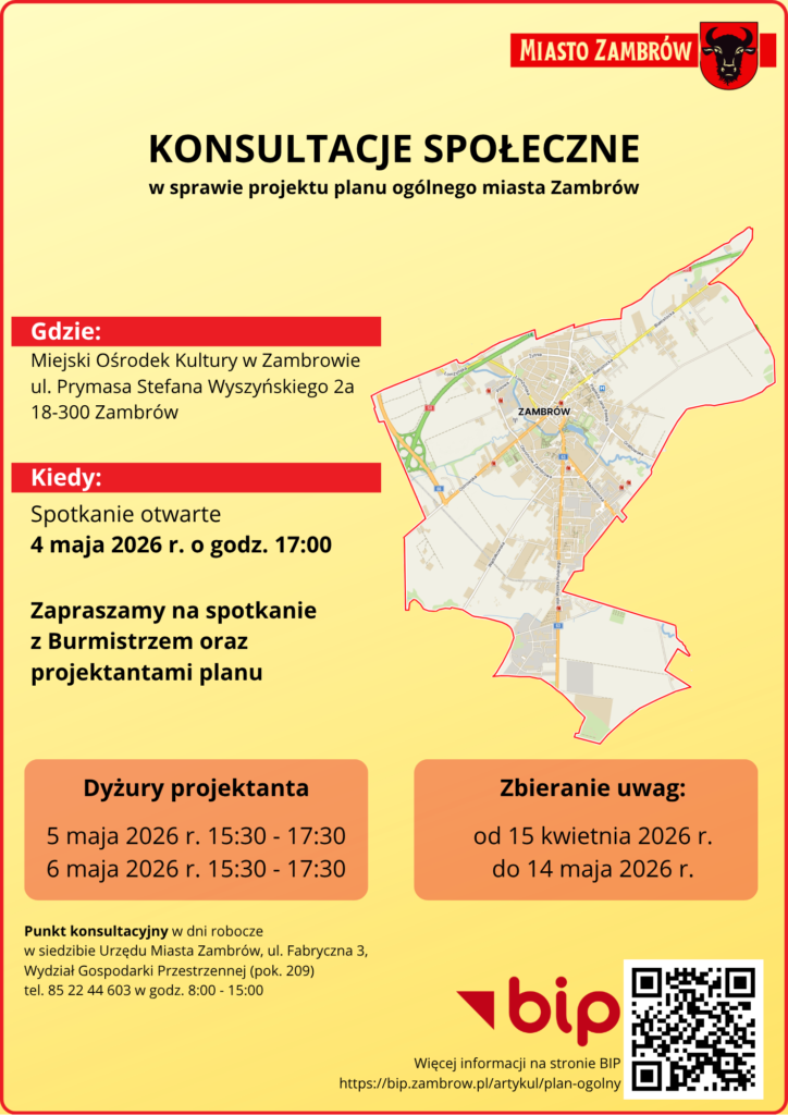 Urząd Miasta Zambrów zaprasza mieszkańców do udziału w konsultacjach społecznych dotyczących projektu planu ogólnego miasta. Spotkanie otwarte z Burmistrzem oraz projektantami planu odbędzie się 4 maja 2026 roku o godz. 17:00 w Miejskim Ośrodku Kultury w Zambrowie przy ul. Prymasa Stefana Wyszyńskiego 2a.
